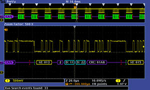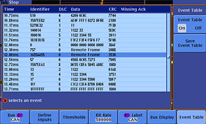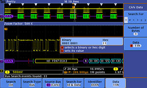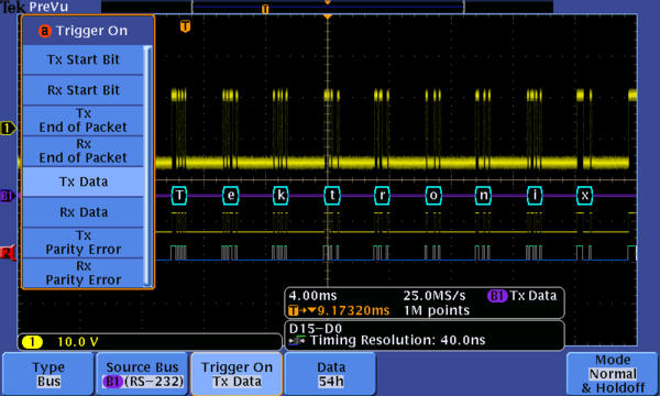 捕獲-觸發(fā)經(jīng)過(guò)RS-232 總線的特定發(fā)送數(shù)據(jù)包。一套完整的觸發(fā)功能(包括特定串行數(shù)據(jù)包內(nèi)容觸發(fā))保證您可以迅速捕獲感興趣的事件。