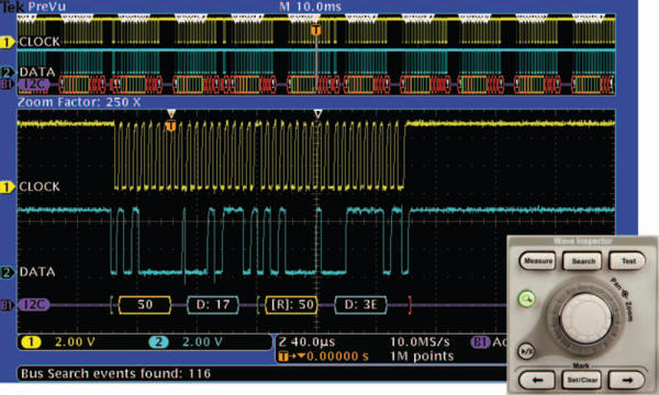 由于其創(chuàng)新的Wave Inspector® 控制功能,MSO/DPO3000 系列提供了業(yè)內(nèi)最完善的搜索和波形導(dǎo)航能力。這些控制功能加快了記錄卷動(dòng)和放大速度。由于獨(dú)特的應(yīng)力感應(yīng)系統(tǒng),您可以在幾秒鐘內(nèi),從記錄一端移到另一端。用戶標(biāo)記可以標(biāo)出以后您可能要參考的任何位置,以便進(jìn)一步進(jìn)行調(diào)查。您也可以自動(dòng)搜索記錄,找到自定義指標(biāo)。Wave Inspector將立即搜索整個(gè)記錄,包括模擬數(shù)據(jù)、數(shù)字?jǐn)?shù)據(jù)和串行總線數(shù)據(jù)。它將自動(dòng)標(biāo)記每次發(fā)生的指定事件,從而可以迅速在事件之間移動(dòng)。