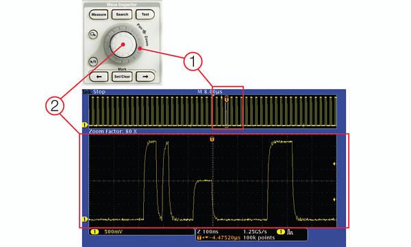 Wave Inspector 控制功能提供了前所未有的波形數(shù)據(jù)查看、導(dǎo)航和分析效率。旋轉(zhuǎn)外部卷動(dòng)控制裝置(1),查看5 M 點(diǎn)記錄。在幾秒鐘內(nèi)從開(kāi)頭到達(dá)結(jié)尾。看到感興趣的東西、想查看更多細(xì)節(jié)?只需旋轉(zhuǎn)內(nèi)部縮放控制裝置(2)就可以了。