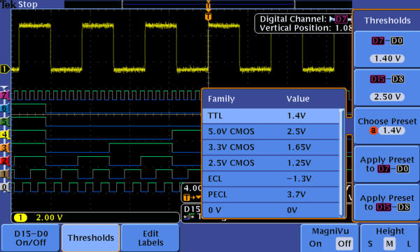 通過(guò)帶色碼的數(shù)字波形顯示,可以簡(jiǎn)單地把多條數(shù)字通道一起放在屏幕上,創(chuàng)建一個(gè)組,然后作為組移動(dòng)數(shù)字通道。可以為每組八條通道設(shè)置門(mén)限值,支持最多兩個(gè)不同的邏輯家族。