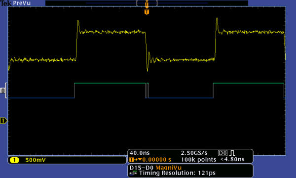MSO3000 系列上的主數(shù)字采集模式將在500 MS/s 時(shí)(2 ns分辨率)捕獲高達(dá)5 M 點(diǎn)。除主記錄外,MSO3000 還提供了一種超高分辨率記錄,稱(chēng)為MagniVu,在高達(dá)8.25 GS/s 時(shí)(121.2 ps)時(shí)采集10,000 點(diǎn)。在每次觸發(fā)時(shí)都采集主波形和MagniVu 波形,可以在顯示屏上隨時(shí)在運(yùn)行或停止之間切換。MagniVu的定時(shí)分辨率明顯要比市場(chǎng)上類(lèi)似的MSO 精細(xì),在數(shù)字波形上進(jìn)行關(guān)鍵定時(shí)測(cè)量時(shí)讓您放心。