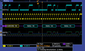 觸發(fā)經(jīng)過(guò)I2C總線的特定數(shù)據(jù)包。黃色波形是時(shí)鐘,藍(lán)色波形是數(shù)據(jù)。總線波形提供了解碼的數(shù)據(jù)包內(nèi)容,包括Start、Address、Read/Write、Data 和Stop。
