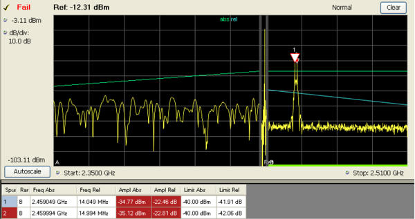 最多20個頻段范圍, 用戶可以在每個范圍內(nèi)選擇檢波器(峰值, 均值, 準峰值), 濾波器(RBW, CISPR, MIL)和VBW。線性或?qū)?shù)頻率標度。絕對功率或相對于載波的測量和違規(guī)。以表格形式確定最多 999 個雜散 ,可以導出為CSV 格式 |