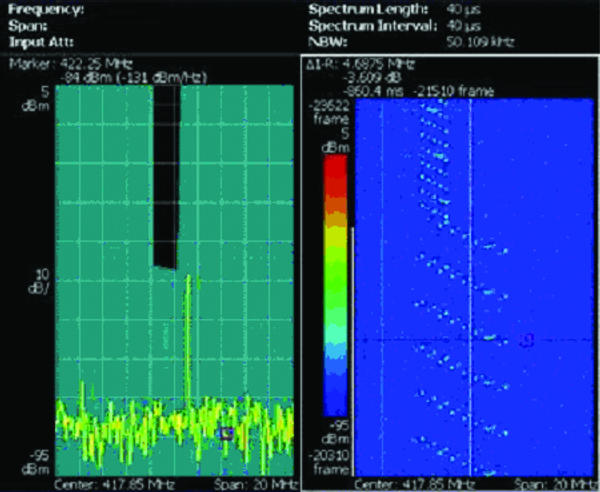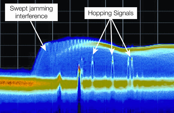 革命性的DPXTM 頻譜顯示技術(shù)可以簡便地發(fā)現(xiàn)其它信號分析儀漏掉的信號。這里看到的是空中捕獲的存在嚴(yán)重屏蔽干擾情況下的跳頻信號。