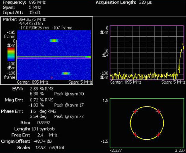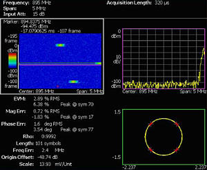 傳統(tǒng)VSA 只能量化中心頻率的調(diào)制質(zhì)量,與 此不同,RSA3000B 可以測量任何跳頻上的 PLL 和調(diào)制質(zhì)量,檢驗整個系統(tǒng)的性能。