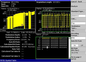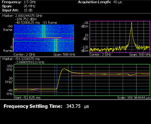 RTSA可以全面分析跳頻無線電的PLL和解調(diào) 性能。RSA3300B還可以使用內(nèi)置調(diào)制域分析 儀,單鍵自動測量頻率穩(wěn)定時間。