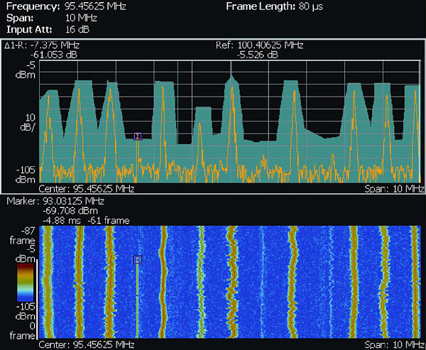 這里,頻率模板觸發(fā)設(shè)置成監(jiān)測頻域中任何頻 譜變化,它觸發(fā)瞬態(tài)干擾。頻譜圖顯示想要的 好信號與干擾瞬態(tài)信號之間的時間關(guān)系,頻譜 畫面顯示頻段中出現(xiàn)干擾信號的那一刻發(fā)生的 情況。FMT 為把已知信號與不想要的干擾隔 開提供了基本工具。