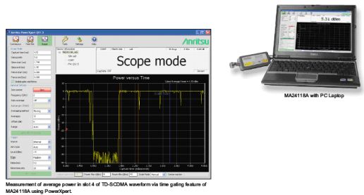 此外,MA24118A同樣可以與安立公司所有配置有USB接口的手持儀表連接使用,例如,MS272XB系列頻譜儀,MT8222A,MS202XB 手持網(wǎng)絡分析儀等,此時手持儀表需要配置Option-9選件來完成信號的測量和顯示.功率探頭通過一根USB傳輸線和儀表連接,儀表起到顯示平均功率的功能。但如果用戶需要測量時隙信號或者使用示波器模式,就必須連接電腦使用,采用 PowerXpert進行測量,或者用戶自己編程操作。
