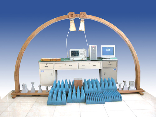 ![]() ? 上圖為本系統(tǒng)典型反射率測試應(yīng)用之二:收發(fā)天線擺放在弓形框上,將標準金屬板放在樣板支架上,在主控計算機的控制下AV1487系列信號源源通過發(fā)射天線將信號發(fā)射出去,發(fā)射信號通過金屬板反射到接收天線(此時相當于全反射),最后AV4036系列頻譜儀接收到此反射信號,獲得一組數(shù)據(jù);然后用待測RAM樣板替換標準金屬板,系統(tǒng)再獲取一組數(shù)據(jù)。通過兩組數(shù)據(jù)相比可以得到被測樣品的反射率。計算機通過GPIB總線獲得測量數(shù)據(jù),可以進行顯示、打印、儲存等后續(xù)操作。