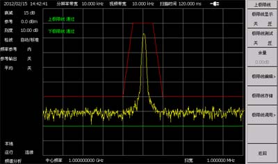 頻譜分析、天饋線測試、網(wǎng)絡(luò)分析都支持極限線測試。極限線可以作為一個可視的參考,也可作為PASS/FAIL判斷的依據(jù),如果測試數(shù)據(jù)超過上極限線或者低于下極限線,揚聲器將發(fā)出“滴”的聲音來提醒用戶數(shù)據(jù)已經(jīng)超差。