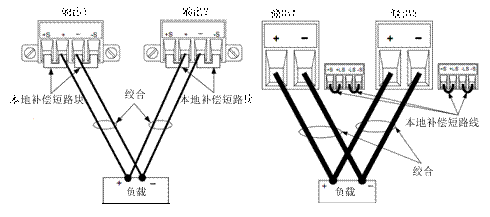 采用兩臺或多臺模塊并聯(lián)可拓展電流輸出范圍。下圖顯示了兩個模塊并聯(lián)的連接方法。并聯(lián)輸出時應(yīng)盡量使每個模塊輸出功率相同!