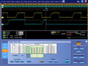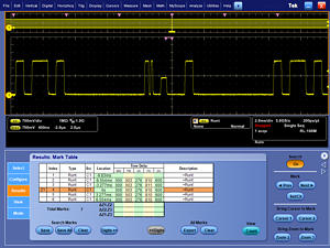 由于創(chuàng)新的Wave Inspector® 控制功能,MSO/DPO5000 系列提供了業(yè)內(nèi)最完善的搜索和波形導(dǎo)航能力。這些控制功能加快了記錄卷動(dòng)和放大速度。由于獨(dú)特的應(yīng)力感應(yīng)系統(tǒng),您可以在幾秒鐘內(nèi),從記錄一端移到另一端。用戶標(biāo)記可以標(biāo)出以后您可能要參考的任何位置,以便進(jìn)一步進(jìn)行調(diào)查。您也可以自動(dòng)搜索記錄,找到自定義指標(biāo)。Wave Inspector將立即搜索整個(gè)記錄,包括模擬數(shù)據(jù)、數(shù)字?jǐn)?shù)據(jù)和串行總線數(shù)據(jù)。它將自動(dòng)標(biāo)記每次發(fā)生的指定事件,從而可以迅速在事件之間移動(dòng)。MSO/DPO5000 系列的高級(jí)搜索和標(biāo)記功能甚至可以同時(shí)搜索8 個(gè)不同的事件,在找到關(guān)心的事件時(shí)停止實(shí)時(shí)采集,大大節(jié)約時(shí)間。