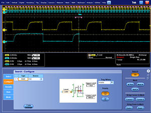 Search按鈕可以自動(dòng)搜索長采集數(shù)據(jù),查找用戶自定義事件。搜索標(biāo)記會(huì)高亮度顯示所有事件發(fā)生,并可以使用前面板Previous(←)和Next(→)按鈕簡(jiǎn)便地搜索。搜索類型包括邊沿、毛刺、脈寬、超時(shí)、欠幅脈沖、碼型、狀態(tài)、建立時(shí)間和保持時(shí)間、跳變和窗口。